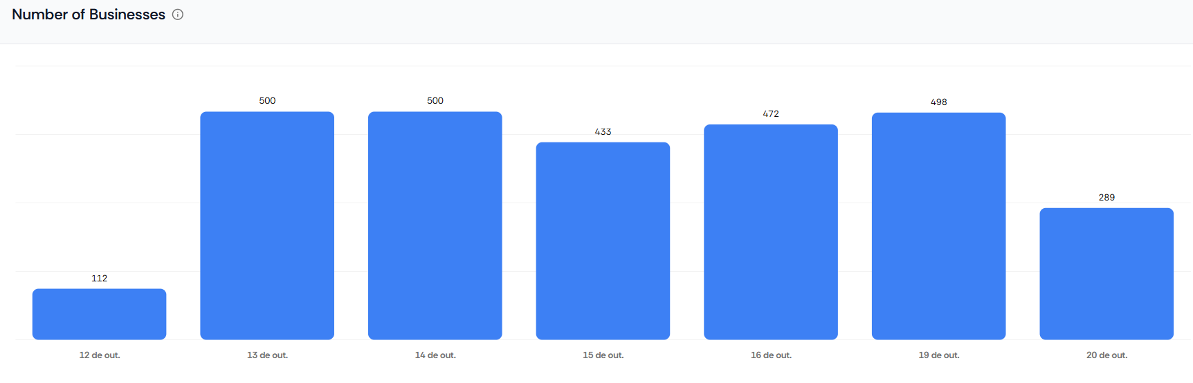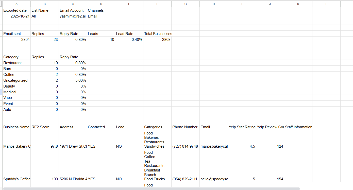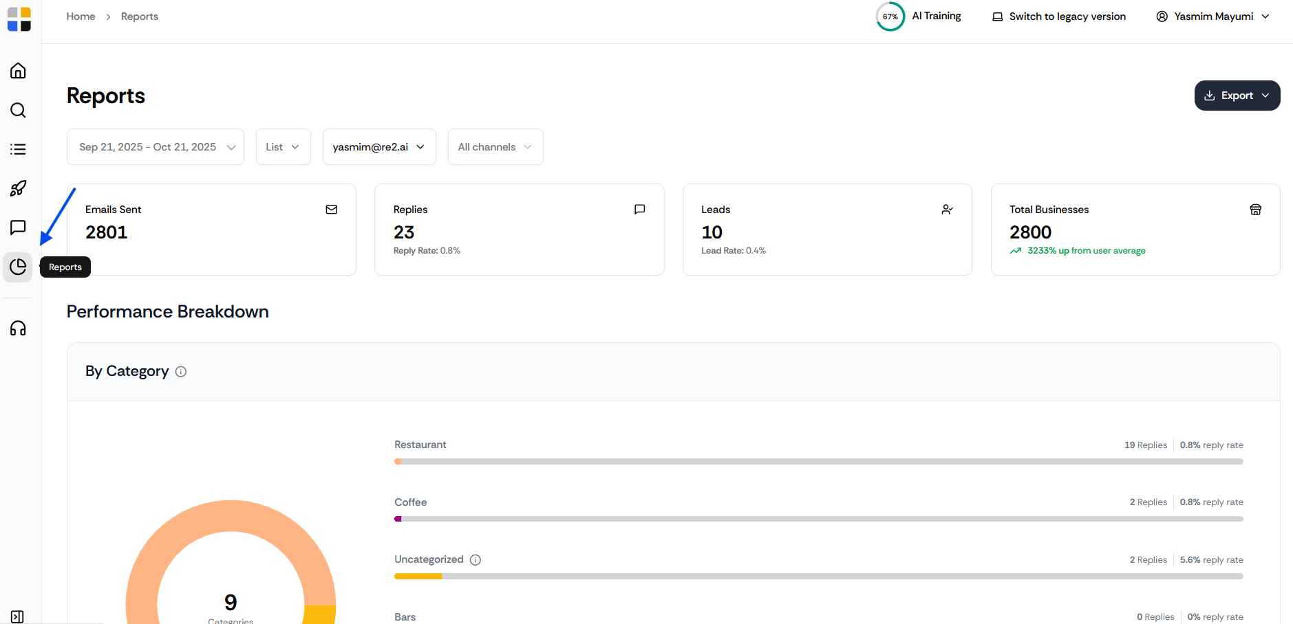In this Reports page, you can see how many emails you've sent, the number of replies and leads, as well as the total businesses reached out to, by breakdown of category and number of businesses per day.