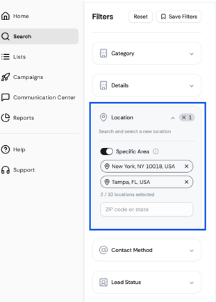 With hyperlocal targeting, you can pull businesses by specific ZIP codes, cities, or states without using a radius.