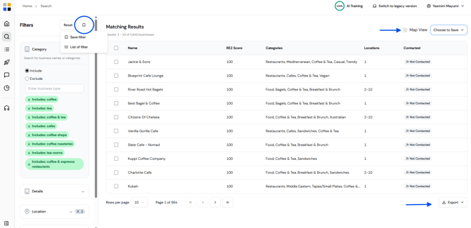 You can also click on the save icon in the right panel to save the filters, and in the left panel, you can switch to map view and export.
