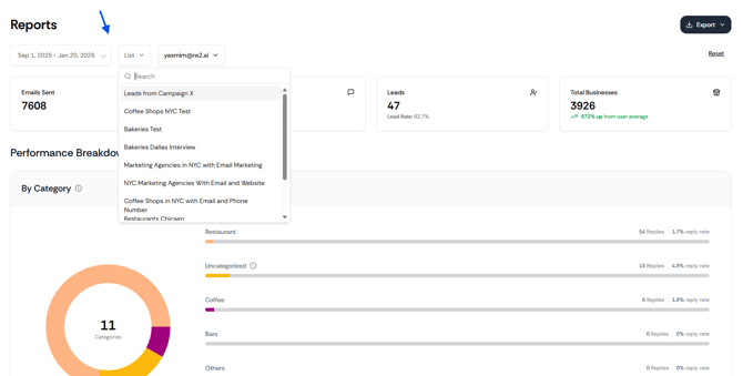 Once you select the account you want to review, you can apply filters such as date range and list to focus on a specific period or campaign.