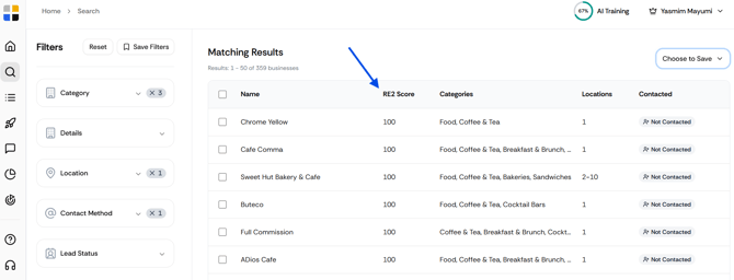 You can click on the RE2 Score column in your search results to sort businesses from highest to lowest score.